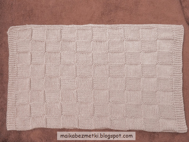 Kocyk najprostszy z możliwych, ale bardzo uroczy. W neutralnym kolorze - odpowiednim dla chłopca i dla dziewczynki. Wzór jakim go zrobiłam to przeplatanka z kwadratów - zamiennie: kwadrat z oczek prawych, kwadrat z oczek lewych. Brzeg to francuz, czyli na prawej i lewej stronie przerabiamy oczka na prawo. Miła robótka i szybka :)